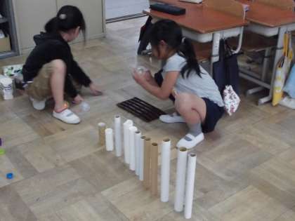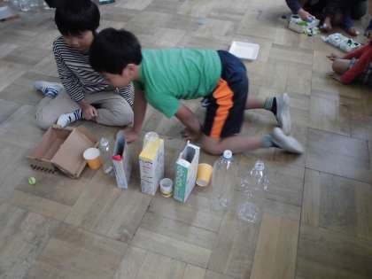 生活の時間に,廃材を使ってどんなあそびができるかを考えました。つんだり,はじいたり,ならべたり・・・工夫しながら,楽しく遊ぶことができました。次はグループに分かれて,遊びのコーナーを考えます。どんなコーナーができるのか楽しみです。