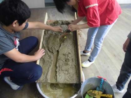 理科の実験をしました。土でゆるい坂をつくり,流れのみぞをつけて水を流しています。流れが速いところ,曲がって流れているところ,流れがゆるやかなところの流れの様子を調べました。流れの両側に印をつけたり,土の様子を見て,「こっちがくずれてきた!」「ここは流れが速そう!」など,流れる水のはたらきを目の当たりにして実感できたようでした。