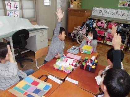 図画工作科「はこかざるんるん」の学習で飾り付けた箱や袋のお気に入りポイントや工夫したところを,友だちに紹介しました。一生懸命作ったものには思い入れがありますね。「ここの色をそろえたよ。」「かみをくしゃくしゃってしてから,少し開いたんだよ。」「どんぐりがくっつけにくかったけど,我慢して押さえていたらしっかりくっついたよ!」と,友だちに嬉しそうに伝えていました。