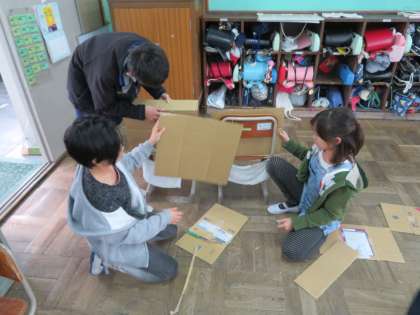 “どんな劇にしたいか”,“そのためにどんなことをがんばるか”を話し合いました。子どもたちからは「集大成にしたい!」や「見ている人を楽しく,そして感動させたい。」,「自分たちも楽しんでやりたい。」,「一つ一つの言葉や行動に意味を持たせる。」,「セリフに思いを込めて,喜怒哀楽を表す。」,「当たり前のことをしっかりとする。」,「集中して練習をする。」などたくさんの意見が出されました。これらの目標に向かってみんなでがんばっています。道具作りも協力して進めています。当日は演技だけではなく,道具や背景などにもご注目ください!