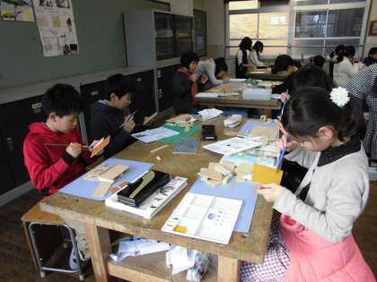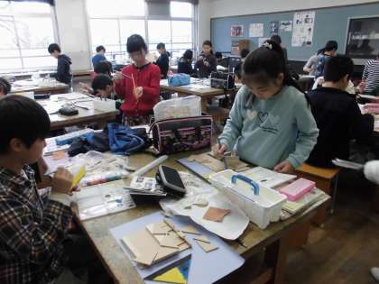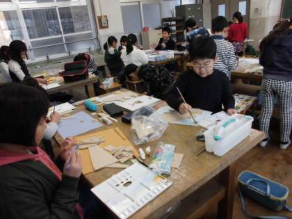 のこぎりで板を切り終えたので,今日から着色を始めました。作りたいもののパーツが全部あるかどうかを確かめてから,絵の具で色を塗ります。みんなとても楽しそうに作品作りをしています。