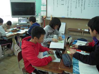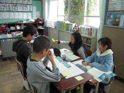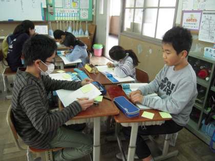 国語では「やまなし」の学習をしています。作者の宮沢賢治について調べたり,文章を場面ごとに考えたりして,朗読で伝えたいことを考えてきました。それらを踏まえての朗読発表会では自分なりに工夫して朗読する様子がたくさん見られました。聞く方も相手の伝えたいことを考えながら聞き交流をしていました。