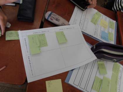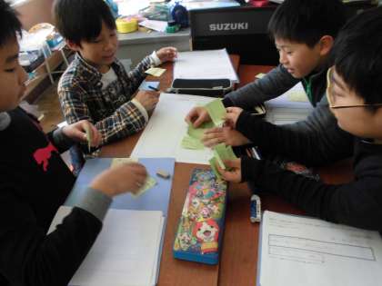 国語では,クラブ活動についてのポスターをつくって3年生に紹介するという活動をします。今日はクラブ活動ごとに集まって,編集会議をしました。「4年生が伝えたいことは何か」「3年生が知りたいことは何か」などを考えて,マトリクスという思考ツールを使ってグループで意見をまとめます。しっかり話し合って,どのグル—プもポスターに各内容を決めることができました。