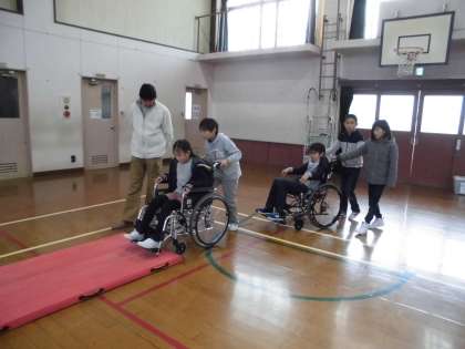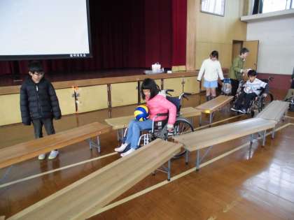 ひざの上にボールをのせてジグザク道を自分で進みます。まだ,マットではぬかるみの道を想定して,介助します。私たちが普段何気なく進んでいるところも,車いすにとっては難しいことを体感しました。