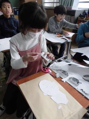 図画工作科では,「楽しくうつして紙がたを」の学習を進めています。運動会で踊った「WaWaWa」を紙版画で表します。目や眉毛,二の腕,足など細かいパーツを作り,それをポージングして糊付けしていきます。細かい作業に苦戦しながらも,作品を作っています。