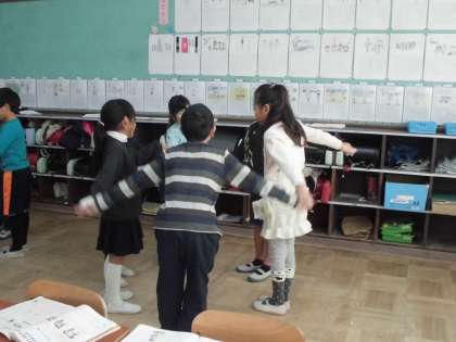 「なべなべそこぬけ」や「ずいずいずっころばし」などのわらべうたを学習しました。親しみのある歌なので,すぐに覚えて手遊びや動きをつけて楽しんでいました。