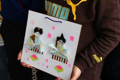 28日(水)に「ひなまつりの会」がありました。千代紙を使って,お雛様を折りました。自分のすきな色を選び,地域の人に丁寧に教えてもらいながら折りました。世界にたった一つのお雛様が完成しました。
