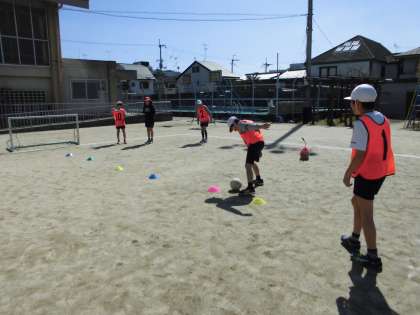 体育の学習は,サッカーが始まりました。サッカーに苦手意識のある子どももよく動き,シュートを決めて喜んでいました。今日で2回目の学習ですが,チームで工夫して練習をしている姿が見られました。これからもチームで励まし合い,楽しく学習をしてほしいと思います。