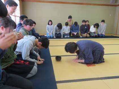 地域の方にお世話になり,巣立ちのお茶会をしていただきました。座り方や立ち方,歩き方,お茶のいただき方など大切な作法を教えていただきました。素晴らしい紫明の宝に触れさせていただきました。