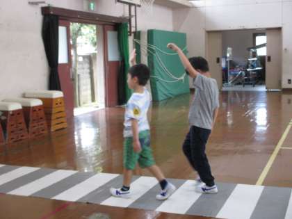 命は一つだけしかありません。その大切な命を守るために,横断歩道の渡り方や信号の渡り方などを教わりました。実際に体育館に道路をつくり,教えていただいたことを実践してみました。
