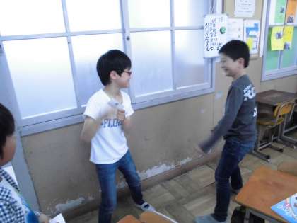 3年生から始まった外国語活動。まずは,いろんな国のあいさつを学習しました。友達を見つけて「ジャンボ!」「ナマステ!」「グーテンターク!」と色々な言葉であいさつをし,「Rock-scissors-paper 123!」と英語でジャンケンをしました。何度も言ううちに慣れて,元気に交流できました。