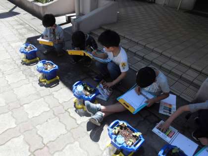 生活科の学習で育てているあさがおの芽がでてきました。小さくてかわいい芽の様子を絵にかいたり,「はっぱがハートの形をしているね」「下のほうが赤くなっている」「げんきにそだってほしい」など,五感をつかって気づいたことや,思ったことをカードに書いていました。
