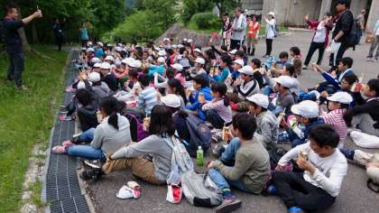 でも、よく頑張りました。玄関前の広場で、まわりの山々を眺め、あそこを歩いてきたんだと聞くと、凄いなー、と感動です。みんなでオレンジジュースで乾杯しました。