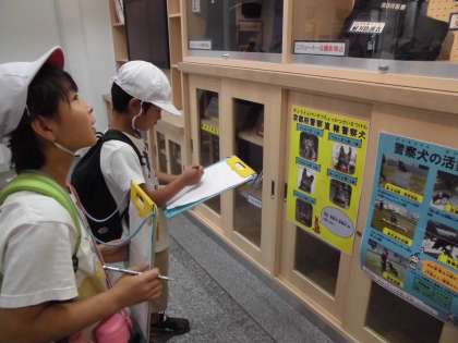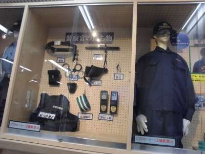 その後,広報センターで様々な資料を見せていただきました。警察官の装備品を見たり,白バイにまたがってみたりしていました。