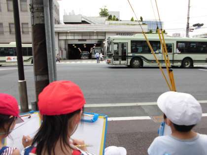 総合「すてきな町紫明」のバスやバスターミナルについて調べているグループで,北大路バスターミナルの様子を見に行きました。バスが出入りする様子や,乗り場の様子などを見て,いろいろな工夫を見つけられました。