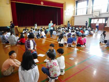 憲法月間朝会の後,なかよしグループの顔合わせがありました。1年生から6年生までのたてわりグループで,自己紹介をしたり,グループのめあてや約束を決めたりしました。6年生がリーダーで中心になり話し合いを進めていました。次回は,なかよしグループ会議で,なかよし遠足についての話し合いをします。