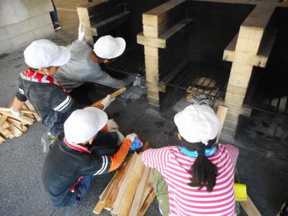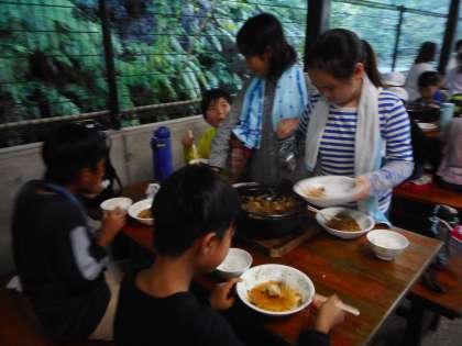 いよいよ野外炊事です。係で分担して野菜を切ったり,火をおこしたりと「すきやき風煮作り」スタートです。「たまねぎが目にしみて痛い。」「火がなかなか熾らない。」と苦労しましたが,最後はどの班もおいしい「すきやき風煮」ができあがりました。とてもおいしかったです。