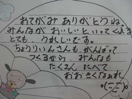 すると,給食調理員さんから,1年生に写真のようなお返事のお手紙が届きました。