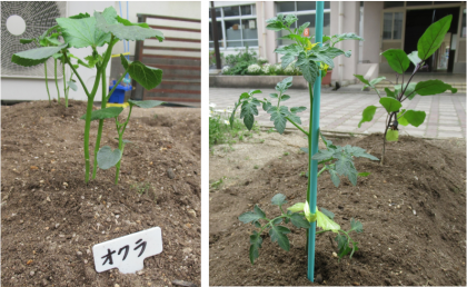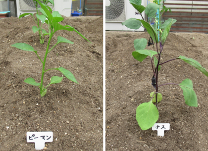 今日,2年生の花壇に生活科で育てる野菜の苗を植えました。種類は「ピーマン,ナス,オクラ,トマト」です。