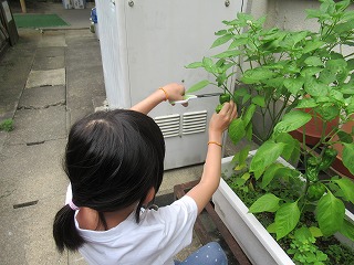 学級園で夏野菜が豊作です。1枚目の写真は大好きなピーマンを収穫する様子です。2枚目の写真は理科で「電池のはたらき」の実験をしている様子です。モーターをより早く回す電池のつなぎ方を学習しています。今週はずっと雨続きだったので,梅雨明けが待ち遠しいですね。