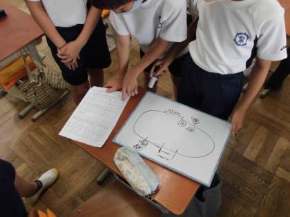 子どもたちは,はじめに教室で前回の反省を活かして,走る順番はどうするかを,ホワイトボードにコースを書きながら考えていました。