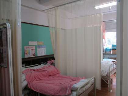保健室内に仕切りのカーテンを設置してもらい,ベッド周りの仕切りができるようになりました。カーテンの色を黄色にしたので,保健室内がぐっと明るくなりました。これを機に保健室内の整理もし,より子どもたちが過ごしやすい保健室を目指していきたいです。