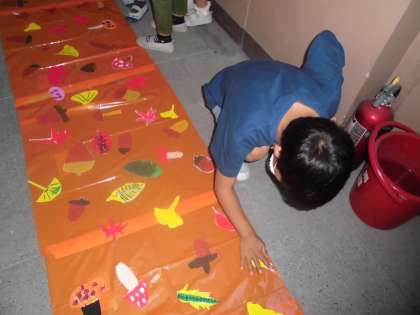 来週のスポーツフェスティバルのアイデア走で使うものを,学年で作りました。紅葉したはっぱなどをイメージして,その下を通って走り抜けます。体を丸くしてうまく走ることができるようにがんばってほしいです。