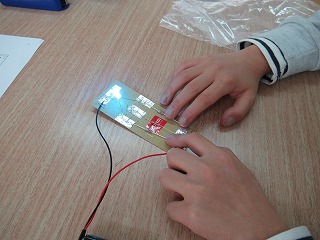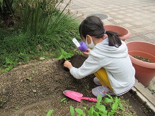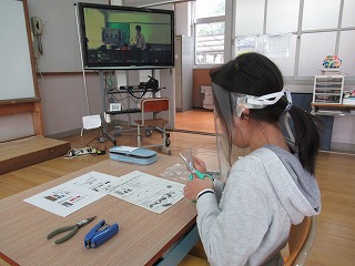 1枚目の写真は,学級園にイチゴの苗を植えているところです。花壇にイチゴの苗を植え,プランターにチューリップの球根を植えました。2枚目,3枚目の写真は,生き方探究館の出前授業のビデオを見ながら,LEDを使った製作をしているところです。3つのスイッチを組み合わせると何色にも変わるのを知り,何度も試していました。