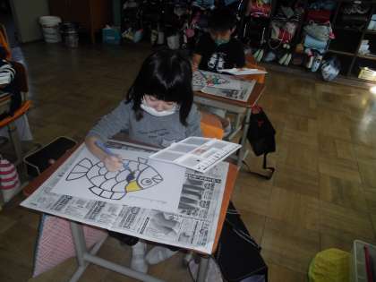 図工の時間に初めて絵の具を使いました。今日は,道具の名前や使い方を確認してから,魚の絵に色をぬりました。「きれいな色になったよ。」「はみださずにぬれた!」とつぶやきながら絵の具での表現を楽しんでいました。