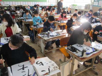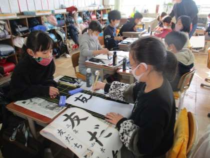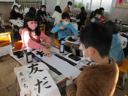 2021年初めての書写で,書初めをしました。『友だち』という文字を画仙紙を使い一筆ずつ丁寧に書きました。友だちとポイントを確かめ合いながら,頑張りました。