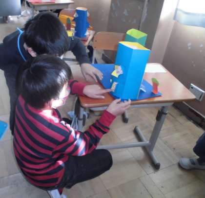 今日は完成した作品をみんなで鑑賞しました。カッターナイフで切り込みを入れてできた窓を開いて中の絵をのぞいたり,たてものの周りに作った物を見たりしながら,友達の表現のよさに気づいていました。