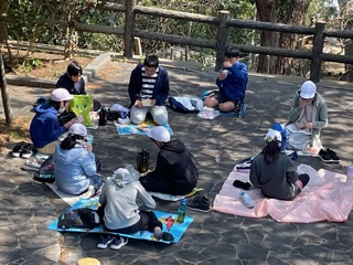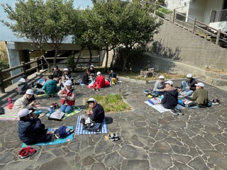 風はありますがとてもいい天気で、海を眺めながらのお弁当は最高です。朝早くからお弁当を作ってくださったおうちの方に感謝して、いたいだきます!
