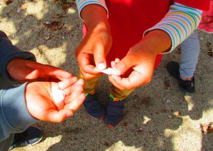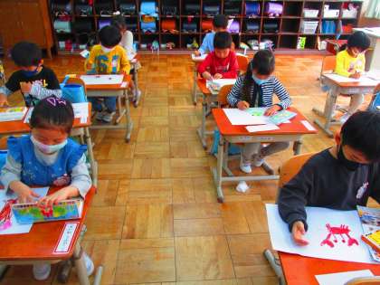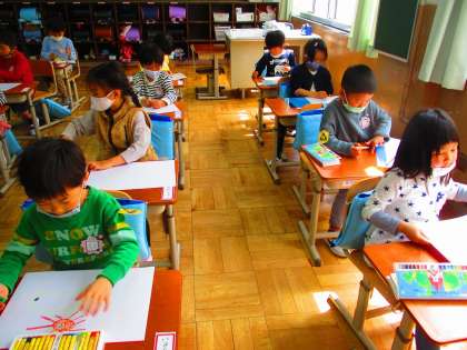 今日は運動場の探検に行きました。大きなプールや砂場,桜の花びらなどたくさん見つけました。その後,教室で自分の好きなものの絵を描きました。思い思いに描いていました。