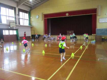 学年でリレーあそびをしました。コーンの周りをぐるぐる周ったりぴょんぴょん跳んだりしながら,チームで声を掛け合い楽しく活動しました。
