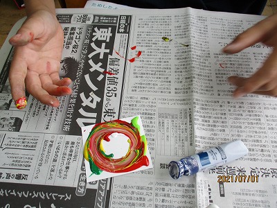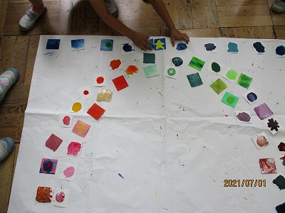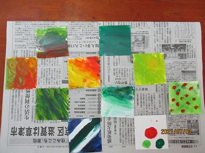 「色合い ひびき合い」という学習で,絵の具をカードにのせて,指でのばしたり,たたいたりしていろいろな模様を描いていきました。その後,グループでカードを合わせたり,題名を決めたりしました。