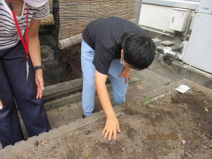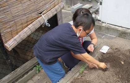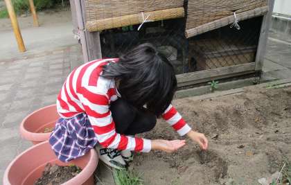 今日の4時間目に大根の種をまきました。小さい種をまいて,やさしく土をかぶせました。今から,どんな芽が出てくるのか楽しみです。