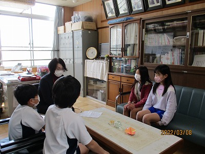 国語科の学習で,テーマを決めて話し合いをしました。先日,南校舎のトイレがきれいに改装され,使用できるようになりました。そこで,これからもきれいに使うためにどうしたらよいのかについて,クラスで話し合ったことを,代表4名が校長先生に伝えにいきました。