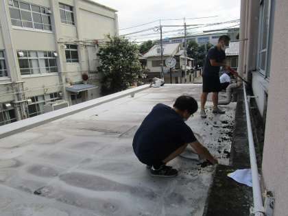 今日は朝から教職員皆で学校をきれいにするために作業をしました。まず、中庭玄関前や職員トイレ、北校舎西出口のそれぞれの屋根の上の苔取りをしたり、プール横の土を掘りおこし運動場に運んだりしました。次に家庭科室、道徳資料室の清掃をしました。とてもすっきりしました。夏休みもあと1週間ほどですが、みんなが2学期からも元気に登校してくるのを教職員皆で待っています。