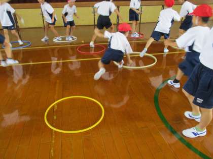 前の時間に楽しんだ「じゃんけんとび」と「かわとび」を選んで楽しんだ後、「かわとび」「はことび」に挑戦しました。体育館のラインを川に、跳び箱1段を山に見立てて跳び越えます。助走をつけて跳び越そうとしたり、ポンポンポンとリズムよく跳ぼうとしたりするなど、児童それぞれが、工夫してとびあそび楽しむ様子が見られました。