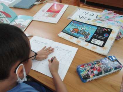 毎週の図書館での学習を楽しみにしています。司書教諭の先生に読み聞かせをしてもらったり、読んだ本をどくしょノートに書いたりして本に親しんでいます。