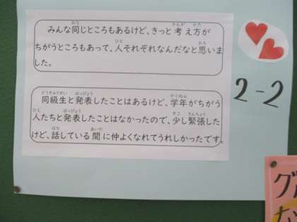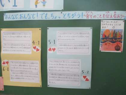 9月9日になかよし集会がありました。なかよしグループごとに「自分の好きなこと」や「学校での好きな時間」などについて、グループの友達と交流しました。活動内容や子どもたちの感想を掲示板で紹介しています。