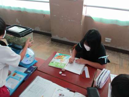 算数の学習では、はかりを使って色々なものの重さを予想して量りました。実際に量ってみると、予想していたよりも重かったり軽かったりしたことに驚いていました。