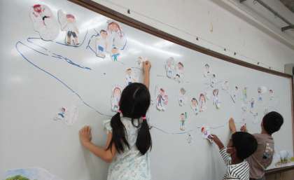 「1年2組の子どもたちが…」で始まる「くじらぐも」の話はどの子も引き付けられるようです。「天までとどけ、一、二、三。」のところを音読するときは、本当に天井まで届くのではないかと思うほど、元気な声とともに、大きくジャンプをしながら読んでいます。