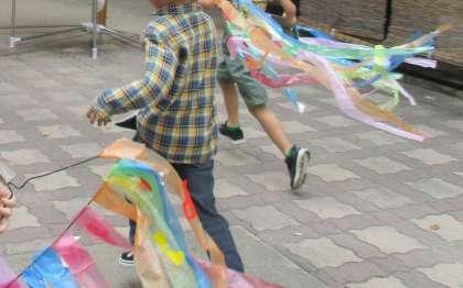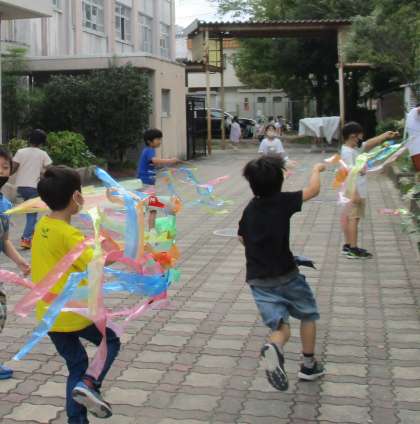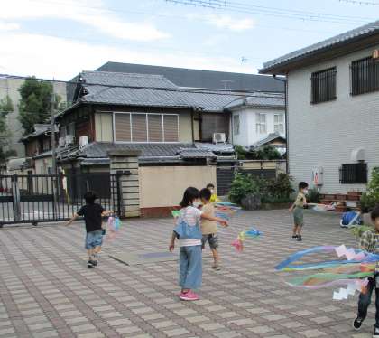 先週の金曜日に作った作品を持って外に出ました。風に当たってひらひら、駆けて揺れてひらひら、くるくる回ってひらひら。秋空の下、カラフルな風が学校に吹きました。