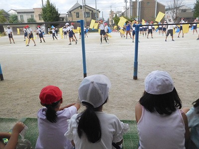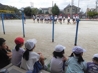 3.4年生の運動会の練習を見学しました。集団行動や、フラッグでの演技を見て、「すごい!」「きれい!」という声が聞こえてきました。