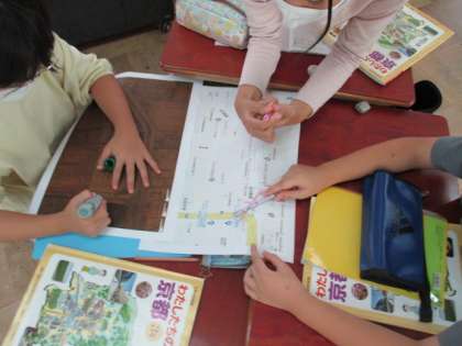 社会科の学習では、昔と今をくらべて、地域の様子にどのような違いがあるのかを確かめています。小学校の名前が今と違っていたり、路面電車が近くに走っていたことなど、たくさんの違いに驚いていました。
