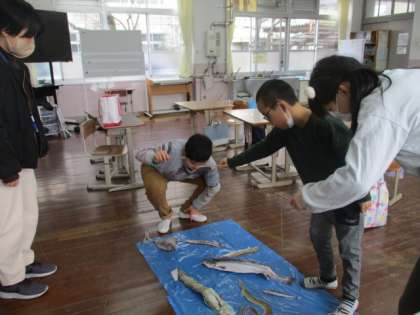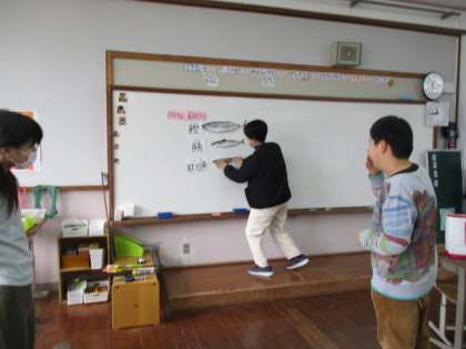 栄養教諭の先生に、給食に出てくる魚について知ろうというめあてで授業をしてもらいました。実物大の魚を釣ったら、漢字が…?!