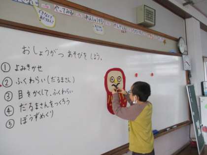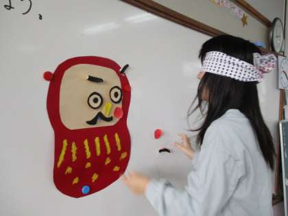『にらめっこしましょ』の紙芝居を読んだ後、だるまの福笑い。それぞれの顔のパーツを確かめた後、目隠ししても挑戦しました。面白い顔になっていると笑っていました。
