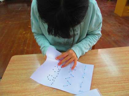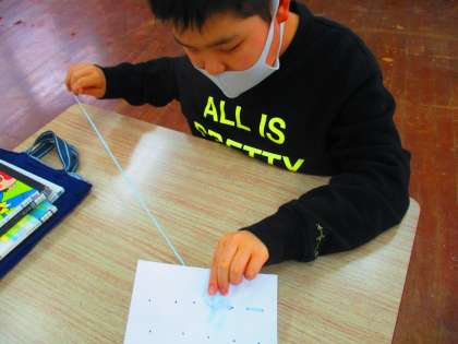 6年生の2人は、針と糸を使って縫い取りをしました。自分で色を選び、直線や波の線を、点に沿って順に塗っていきます。今日は初めてでしたがよく見ながら集中してできました。