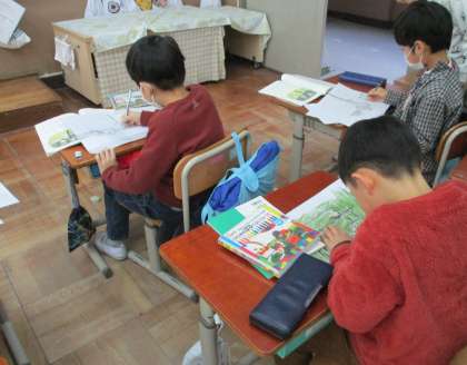 「たぬきの糸車」を読んで、好きなところを見つけました。教科書を見ながら、好きなところを書き写したり、絵を描いたりしました。絵の裏に書き写した文章を貼って、紙芝居風に読む練習を友だちと一緒にしました。